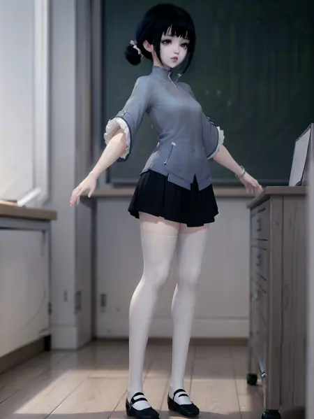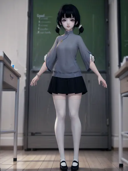 정면: loli, solo, lora:\[옷\]-\[모등현-천도소녀\]tdsvmdx\_v2\[LyCORIS\]:0.65, tdsvmdx, 초기 청소년, 작은 체형, 검은 머리, 긴 머리, 머리 장식, 파란색 중국식 셔츠, 평평한 가슴, 팔찌, 검은 주름치마, (흰색 허벅지 양말:1.2), 검은 로퍼,