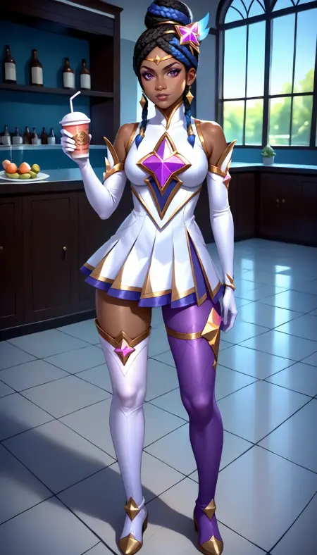 star guardian senna, (asymmetrical legwear, single leg white thighhighs, (single leg purple pantyhose:1.2):1.3), gloves, elbow gloves, hair bun, looking at viewer, black hair, hair ornament, gloves, dress, jewelry, standing, purple eyes, detached sleeves, alternate costume, hair bun, dark-skinned female, hand on hip, single hair bun,