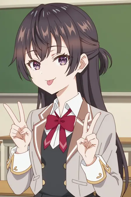 유키 학교 복장 | 긴 머리, 갈색 머리, 반쪽 올린 머리, 보라색 눈, 학교 복장, 회색 재킷, 빨간 리본,