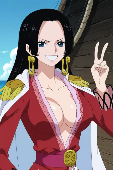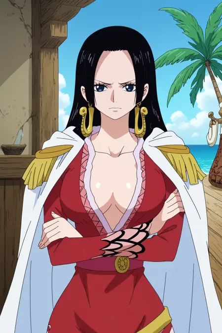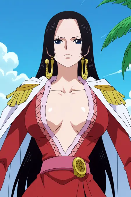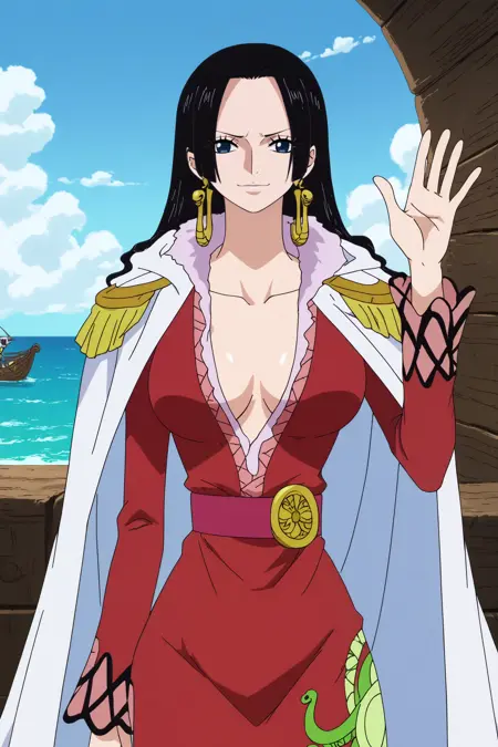 トリガー:boa hancock,1girl,solo,mature,earrings, jewelry, long_hair, epaulettes, cape,breasts, large_breasts, snake,blue eyes,dress,red dress,very_long_hair