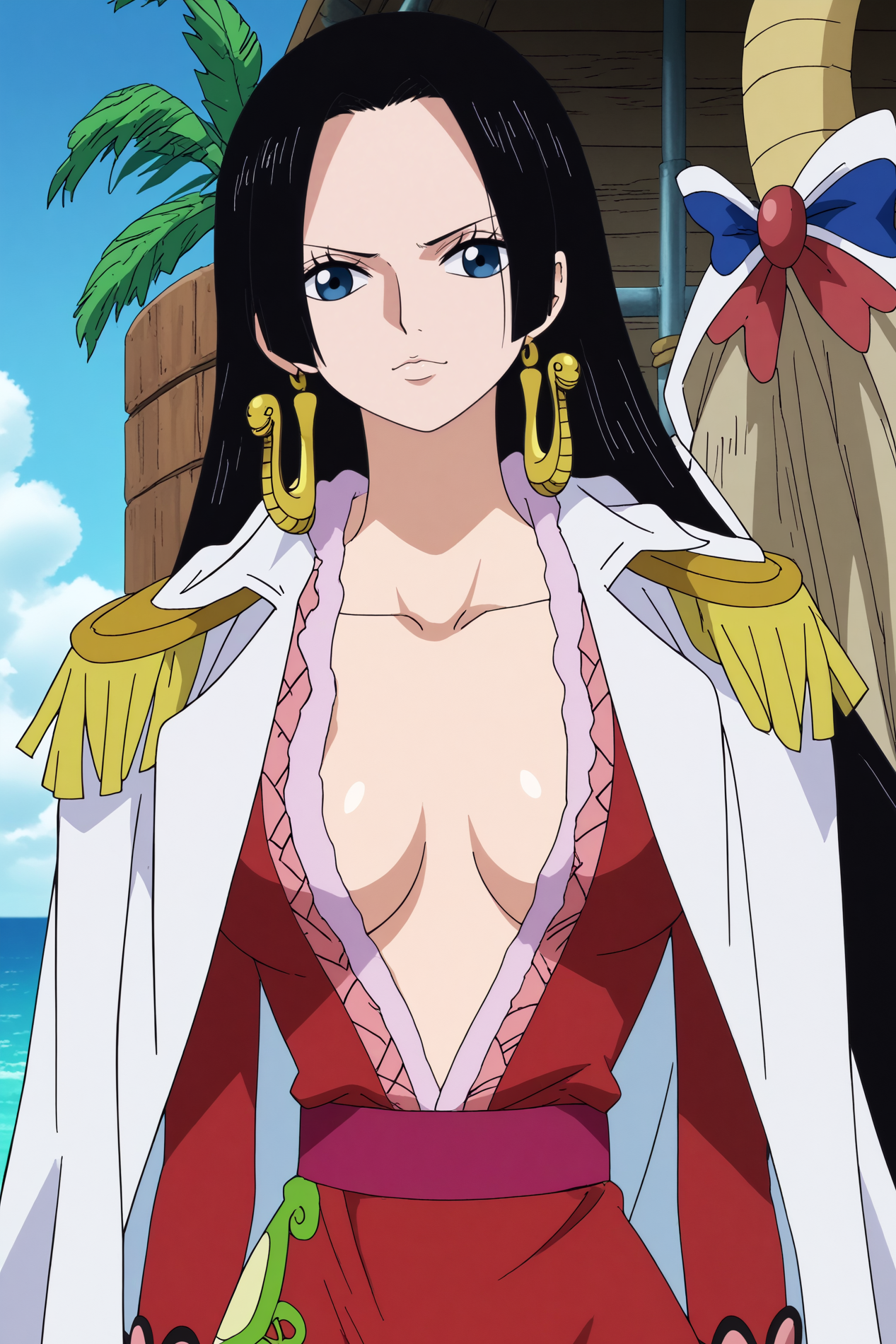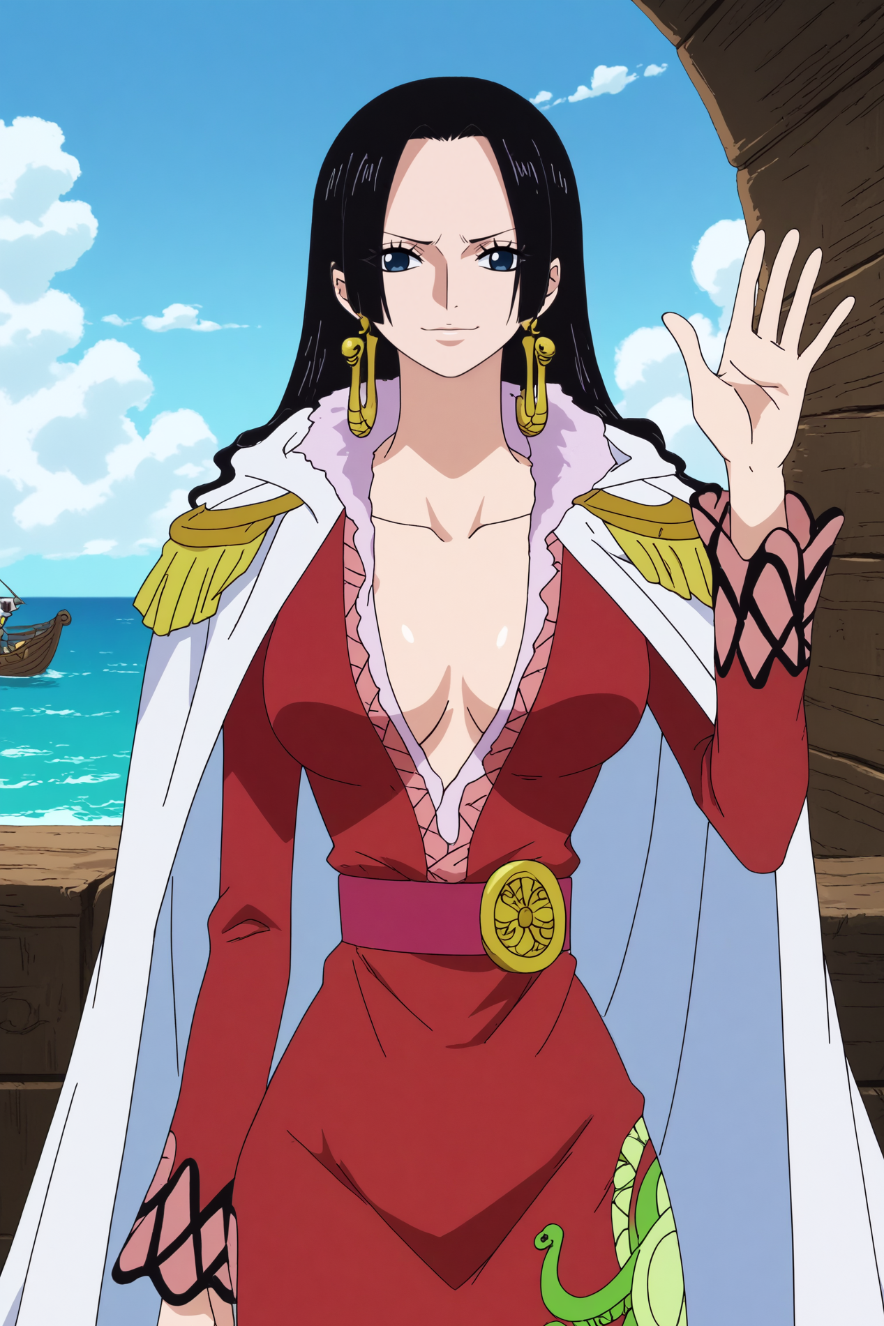 Triggers : boa hancock,1girl,solo,mature,earrings, jewelry, long_hair, epaulettes, cape,breasts, large_breasts, snake,blue eyes,dress,red dress,very_long_hair
