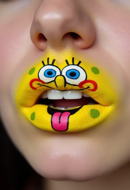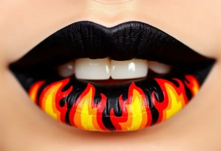 The image is a photograph showcasing a close-up view of a person's lips, specifically focusing on a striking, artistic makeup design that is painted to resemble a
