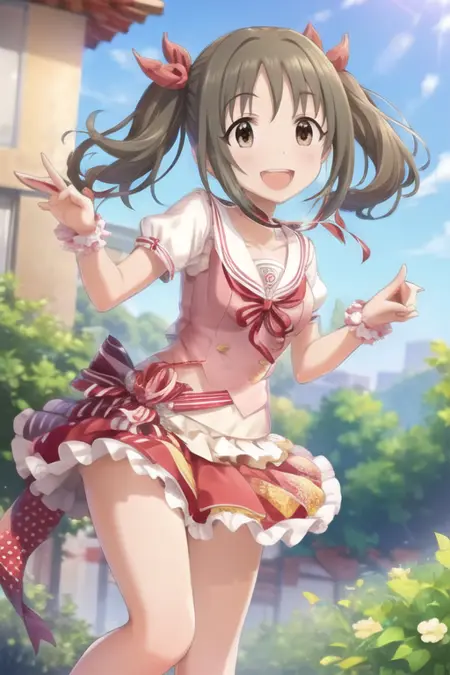 imai kana, twintails, red hair ribbon, smile, open mouth,