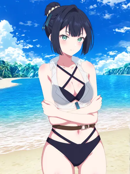 summer's disciple alexa \(epic seven\), 黒髪, 短髪, 単一の髪の結び目, 緑の目, ブラックビキニ, 透けシャツ, クロップトップ, 交差ハルター, ベルト, 肩の露出