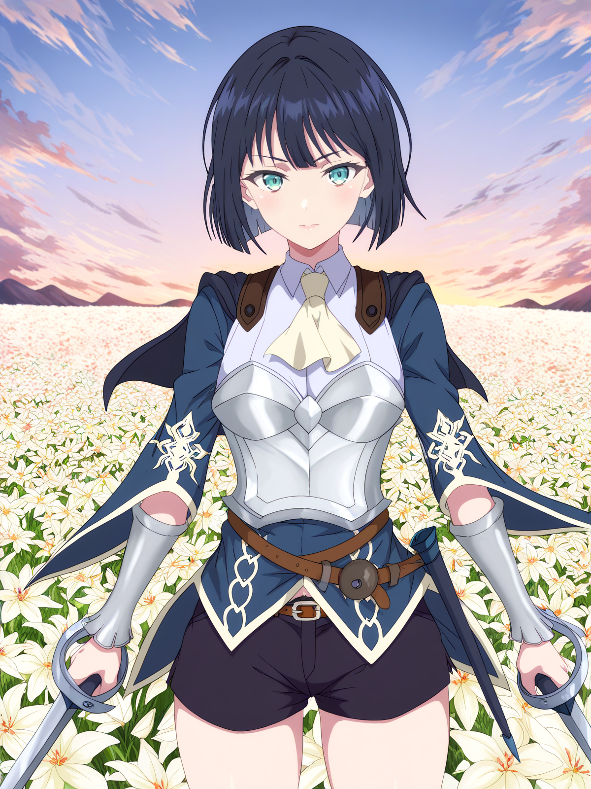 alexa \(epic seven\), 검은 머리, 단발, 녹색 눈, 갑옷, 가슴판, 짧은 반바지, 팔보호대, 애스컷, 캐피레트, 벨트
