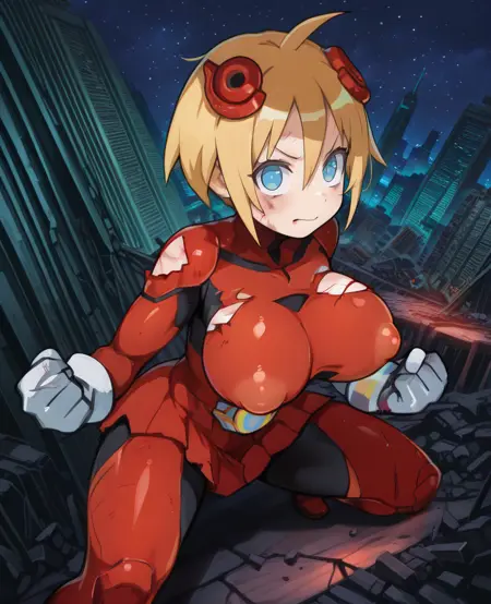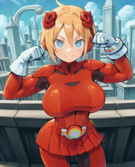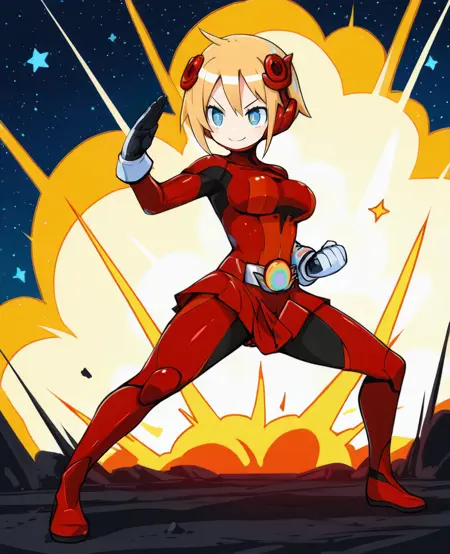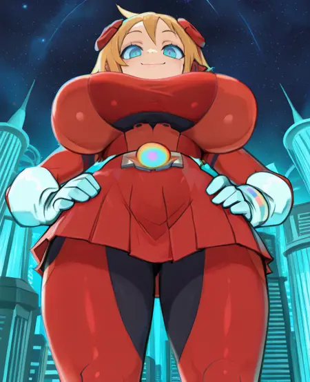 빨간 바디수트, 흰 장갑, 빨간 스커트, 빨간 부츠, 벨트 - 머리카락에 붉은 장식품
