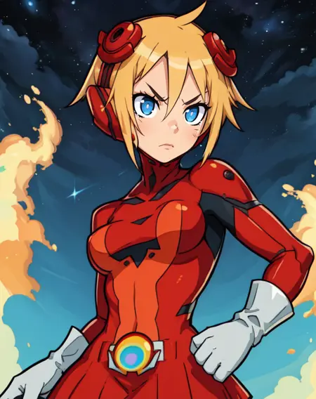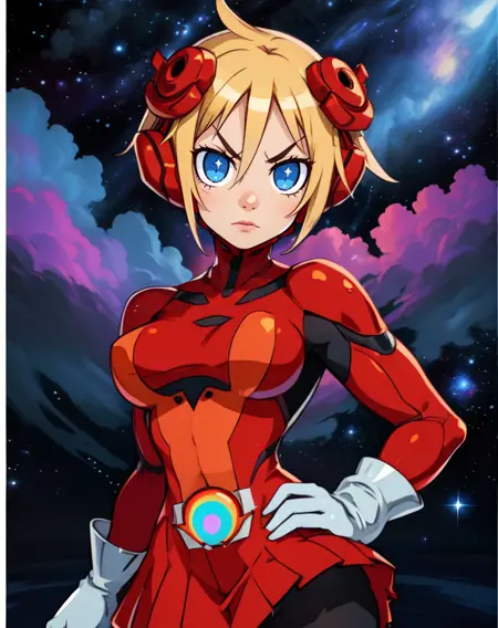 红色紧身衣、白色手套、红色短裙、红色靴子、腰带——头发红色饰物,