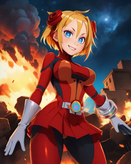 红色紧身衣、白色手套、红色短裙、红色靴子、腰带——头发红色饰物,