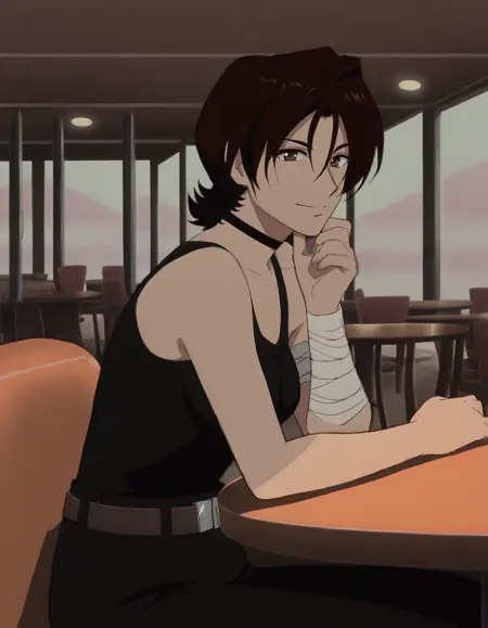 ovirowa, choker, black tank top, bare shoulders, bandaged arm, belt, pants, black pants