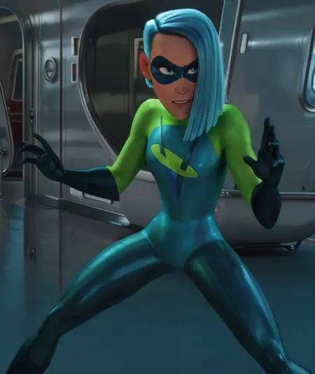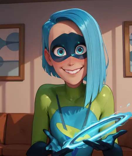 도미노 마스크, 다채로운 바디수트 또는 바디수트, 부츠, 녹색 소매 또는 장갑, 검은 레깅스