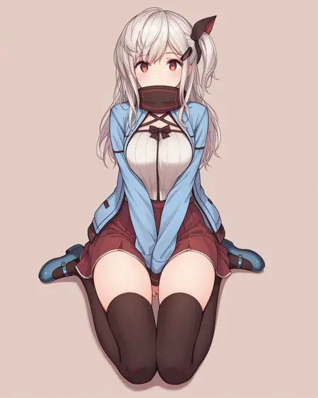 alps, jacket, long hair, one side up, red miniskirt, black thighhighs, large breasts