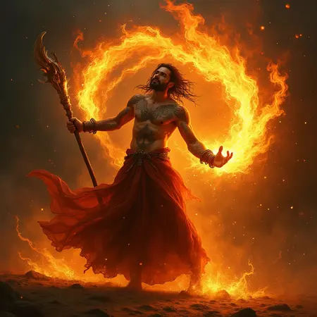 一位强大的火系法师站立在火山地貌中,手持一根流淌着熔岩、刻有发光符文的法杖,四周火焰与余烬盘旋,释放出壮丽的火焰冲击。与黑暗焦黑的岩石形成鲜明对比,动态战斗姿态,由兹德斯瓦夫·贝克辛斯基与格雷格·鲁特科夫斯基创作的幻想概念艺术,细节丰富,色彩浓郁,光影戏剧化,在ArtStation和DeviantArt上风靡,使用虚幻引擎5制作,4K超高清图像
