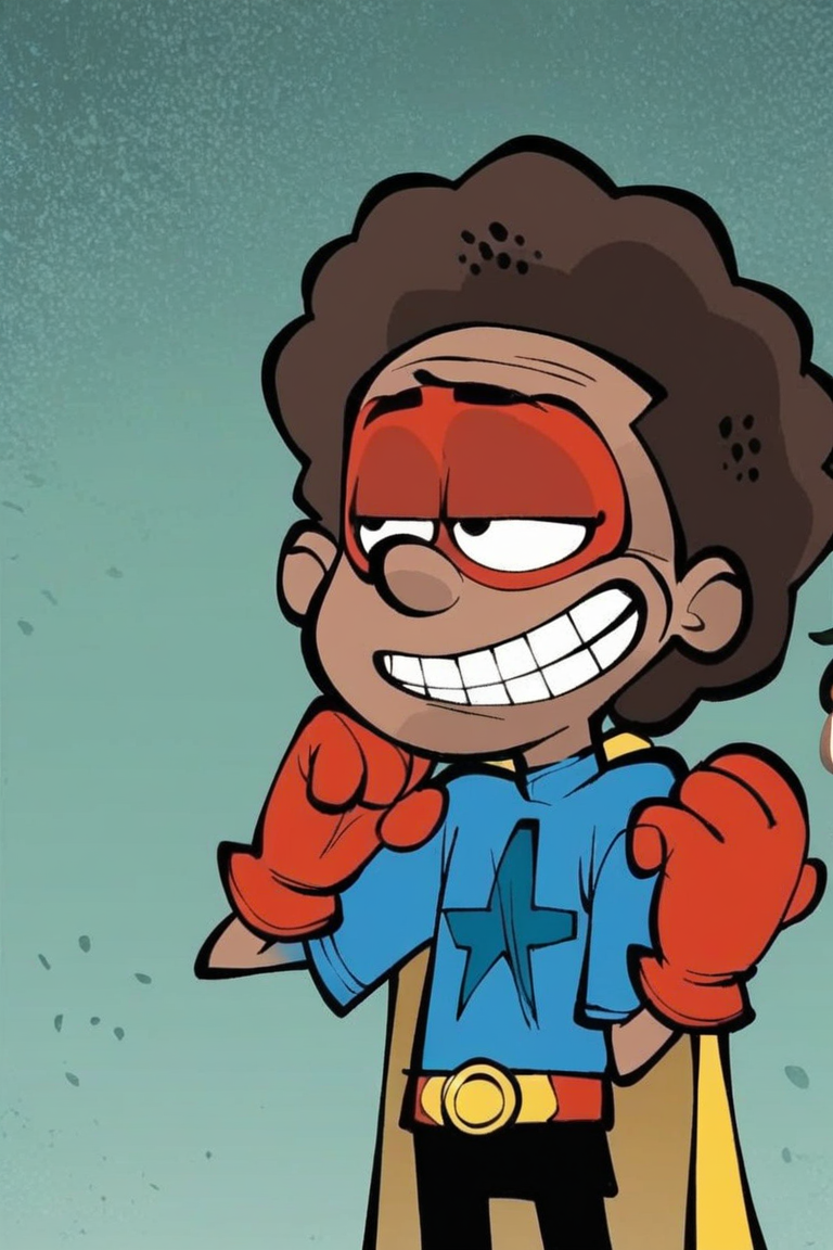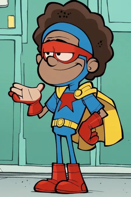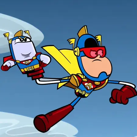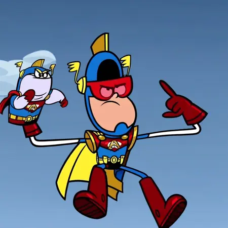 Prompt: Atomic Puppet, solo, red blue and yellow super hero costume, super hero costume, super hero, red goggles, two side winged headpiece, yellow cape, thick red boots, red glove, 'A' Logo in the middle, AP Puppet,hand puppet, puppet