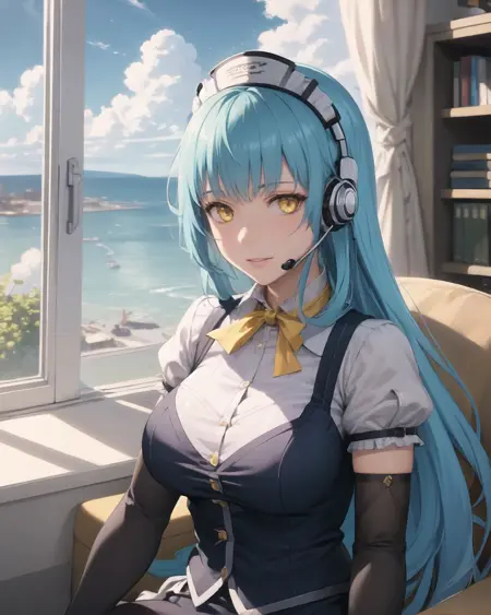 <lora:RisetteCasual:0.85> Risette Twinings, yellow eyes, blue hair, long hair, blunt bangs, large breasts,