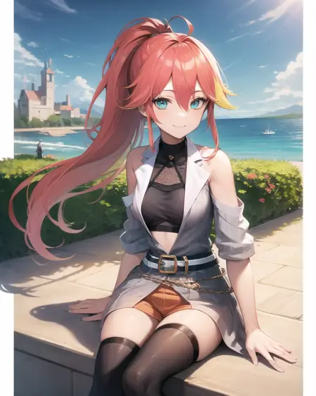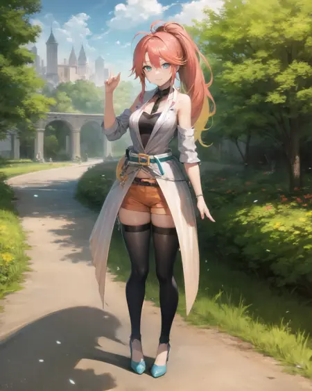 <lora:Judith-11:0.9>, Judith Ranster, orange hair, streaked hair, multicolored hair, ponytail, ahoge, aqua eyes, small breasts,