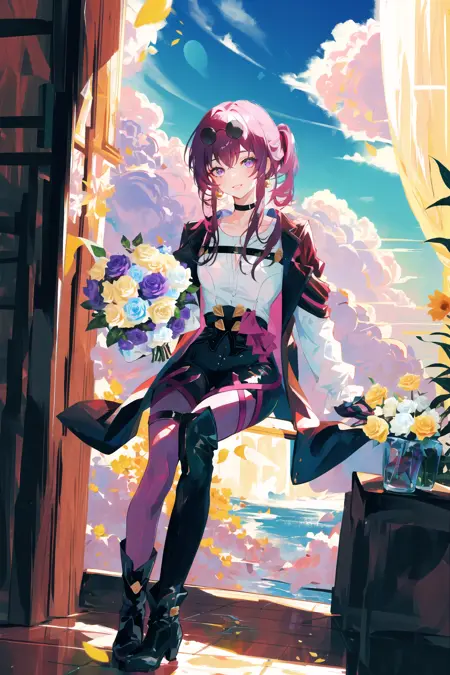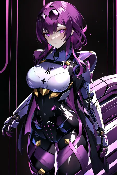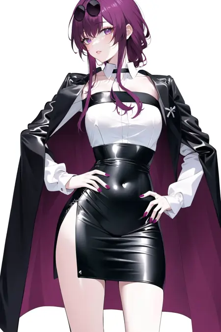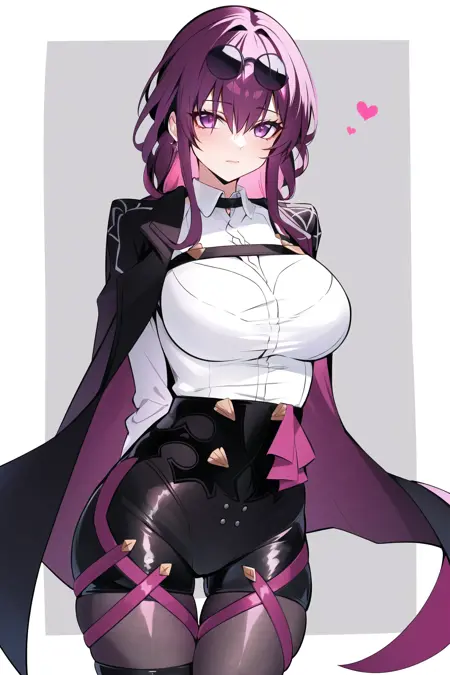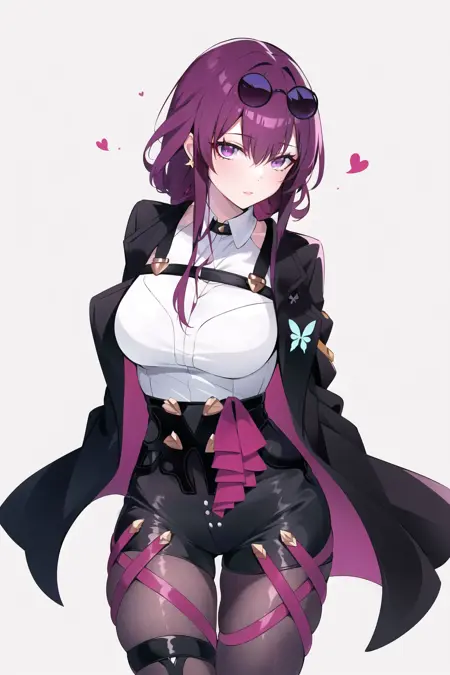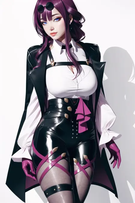 衣装:黒いジャケット、頭に眼鏡、ハイウエストショートパンツ、ジャケット、ジュエリー、長い髪、長い袖、タイツ、ショートパンツの下のタイツ、紫の目、紫の手袋、紫の髪、シャツ、ショートパンツ、白いシャツ、蝶のピン、片側だけの脚部装飾