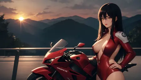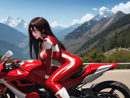 站在摩托车旁,调皮的眼神,高速公路背景,山脉与天空背景