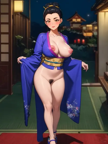 kimono, yellow kimono, single hair bun, short hair, hair ornament
