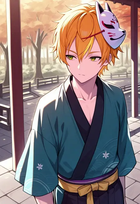 1소년, 남성 중심, 단독, 녹색 눈, 다색 머리, 주황색 머리, 금발, 단발, 눈 사이 머리, 앞머리, 일본 복장, 마스크, 머리 위 마스크, 여우 마스크,