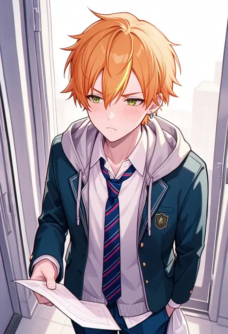 1소년, 남성 중심, 단독, 녹색 눈, 다색 머리, 주황색 머리, 금발, 단발, 눈 사이 머리, 앞머리, 보석, 귀걸이, 학교 유니폼, 셔츠, 흰 셔츠, 칼라 셔츠, 넥타이, 줄무늬 넥타이, 줄무늬, 후디, 회색 후디, 끈, 후드, 재킷, 파란 재킷, 긴 소매, 벌어진 재킷, 벌어진 옷, 바지, 파란 바지,