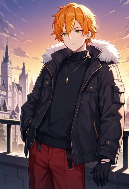 1소년, 남성 중심, 단독, 녹색 눈, 다색 머리, 주황색 머리, 금발, 단발, 눈 사이 머리, 앞머리, 보석, 귀걸이, 단일 귀걸이, 스웨터, 검은 스웨터, 재킷, 검은 재킷, 모피 트림, 장갑, 검은 장갑, 바지, 빨간 바지, 부츠, 검은 신발, 십자 매듭 신발,