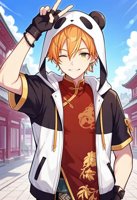 1소년, 남성 중심, 단독, 녹색 눈, 다색 머리, 주황색 머리, 금발, 단발, 눈 사이 머리, 앞머리, 보석, 귀걸이, 단일 귀걸이, 중국 복장, 재킷, 짧은 소매, 후드 재킷, 벌어진 재킷, 벌어진 옷, 셔츠, 빨간 셔츠, 장갑, 검은 장갑, 손가락 없는 장갑, 후드, 동물 후드, 판다 후드, 팔찌, 피어싱,