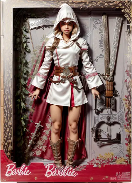 (best quality:1.15), (masterpiece:1.15), (detailed:1.15), (realistic:1.2), Dappled Light, analog style, lightroom, cinematic, hdr, raw, (intricate:1.4), high quality, soothing tones, intricate details, low contrast, no humans, inboxDollPlaySetQuiron style, abs, (The Witcher (Geralt of Rivia): Geralt's attire is practical and rugged, befitting a skilled monster hunter. He wears a dark, leather-based armor that provides protection while allowing for flexibility. The armor consists of a chest plate, shoulder pads, and gauntlets. Geralt's armor is adorned with intricate designs, often featuring the emblem of the School of the Wolf. He pairs the armor with dark trousers and knee-high boots, both made of sturdy leather. Geralt's white hair is often styled in a messy, windswept manner, adding to his rugged appearance. He carries two swords, one steel for humans and one silver for monsters, sheathed at his side.:1.2), gift box, playset, in a box, full body, toy playset pack, in a gift box, premium playset toy box,lora:quiron_inboxDollPlaySet_v2_lora:0.39