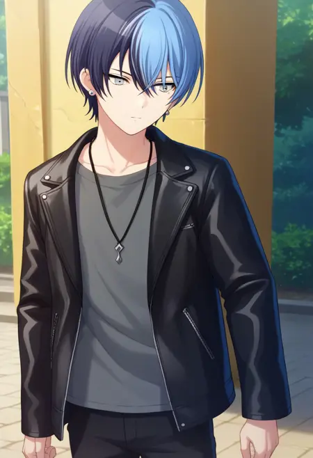 1소년, 남성 중심, 단독, 회색 눈, 이색 머리카락, 다색 머리카락, 이톤 머리카락, 파란색 머리카락, 검은색 머리카락, 단발, 눈 사이 머리카락, 앞머리, 액세서리, 귀걸이, 셔츠, 회색 셔츠, 목걸이, 재킷, 검은색 재킷, 가죽 재킷, 가죽, 벌어진 재킷, 벌어진 옷, 바지, 검은색 바지, 신발, 빨간색 신발, 운동화,