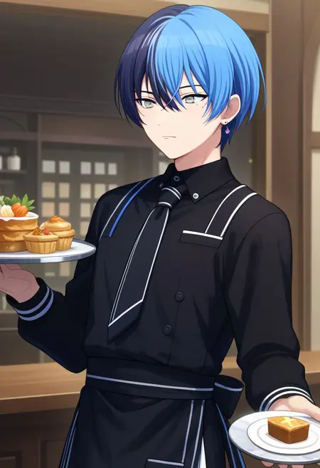 1소년, 남성 중심, 단독, 회색 눈, 이색 머리카락, 다색 머리카락, 이톤 머리카락, 파란색 머리카락, 검은색 머리카락, 단발, 눈 사이 머리카락, 앞머리, 액세서리, 귀걸이, 웨이터, 셔츠, 검은색 셔츠, 더블 브라스팅, 단추, 넥타이, 검은색 넥타이, 앞치마, 허리 앞치마, 검은색 앞치마,