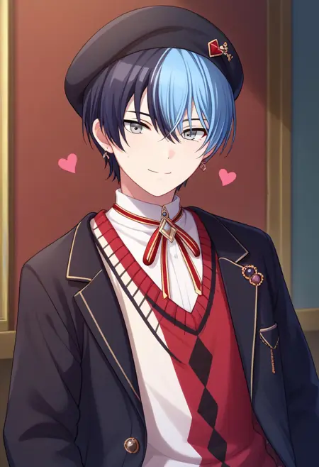 1소년, 남성 중심, 단독, 회색 눈, 이색 머리카락, 다색 머리카락, 이톤 머리카락, 파란색 머리카락, 검은색 머리카락, 단발, 눈 사이 머리카락, 앞머리, 모자, 베레모, 셔츠, 흰색 셔츠, 리본, 목 리본, 스웨터, 아르게일, 빨간색 스웨터, 재킷, 검은색 재킷, 벌어진 재킷, 벌어진 옷, 액세서리, 귀걸이, 하트, 상반신