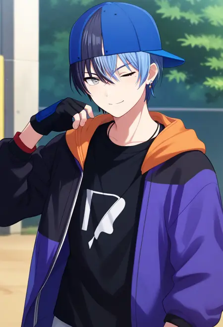 1소년, 남성 중심, 단독, 회색 눈, 이색 머리카락, 다색 머리카락, 이톤 머리카락, 파란색 머리카락, 검은색 머리카락, 단발, 눈 사이 머리카락, 앞머리, 액세서리, 귀걸이, 모자, 야구모자, 뒤집어 쓴 모자, 셔츠, 검은색 셔츠, 재킷, 보라색 재킷, 검은색 재킷, 다색 재킷, 긴 소매, 벌어진 재킷, 벌어진 옷, 장갑, 검은색 장갑, 손가락 없는 장갑,