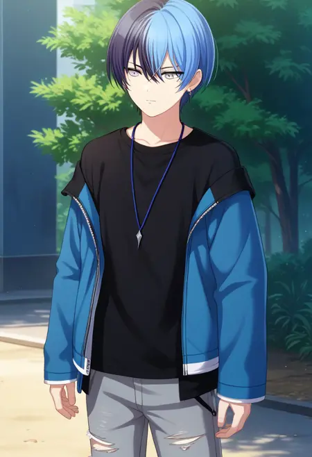 1소년, 남성 중심, 단독, 회색 눈, 이색 머리카락, 다색 머리카락, 이톤 머리카락, 파란색 머리카락, 검은색 머리카락, 단발, 눈 사이 머리카락, 앞머리, 액세서리, 귀걸이, 셔츠, 검은색 셔츠, 목걸이, 재킷, 파란색 재킷, 긴 소매, 벌어진 재킷, 벌어진 옷, 바지, 회색 바지, 찢어진 옷, 찢어진 바지, 신발, 흰색 신발,