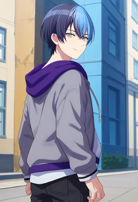 1소년, 남성 중심, 단독, 회색 눈, 이색 머리카락, 다색 머리카락, 이톤 머리카락, 파란색 머리카락, 검은색 머리카락, 단발, 앞머리, 셔츠, 후디, 후드, 보라색 후디, 재킷, 회색 재킷, 벌어진 재킷, 벌어진 옷, 바지, 검은색 바지, 신발,