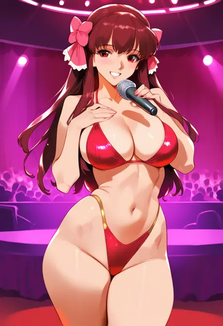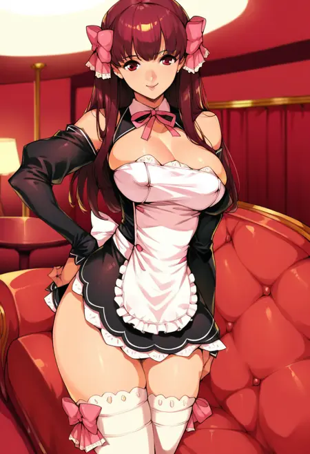 Trigger: amane, long hair, red hair female, hair bow, large breasts, waitress, cleavage, bare shoulders, white thighhighs,