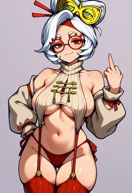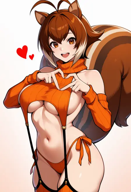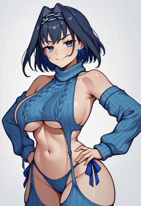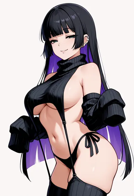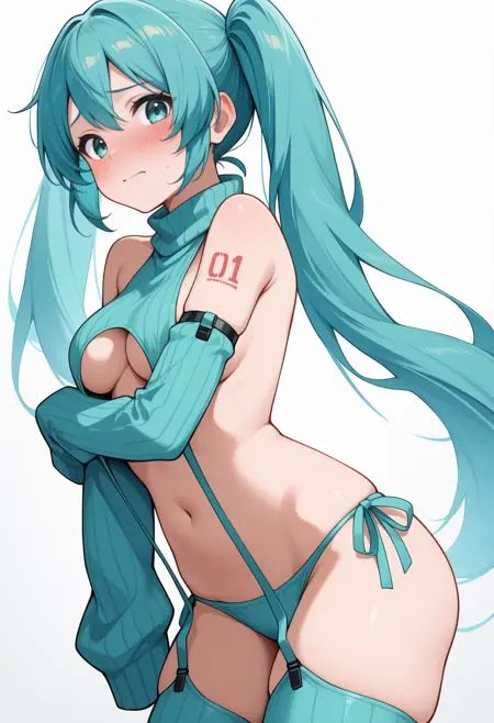 トリガー+追加タグ: vrgndstryrswtr, white sweater, ribbed sweater, turtleneck sweater, sleeveless sweater, sideboob, underboob, white sleeves, detached sleeves, ribbed sleeves, white panties, side-tie panties, ribbed legwear, white thighhighs, white garter straps, bare shoulders, stomach