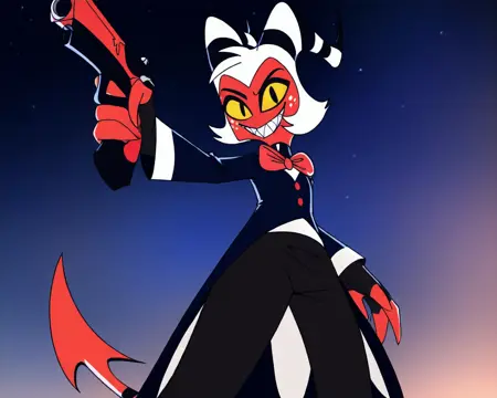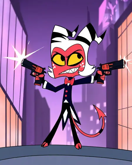 舞台の左側に現れるのは、Vivziepopのヒットアニメ『Helluva Boss!』のモクシーだ!(アーティストのVivzieと『Helluva Boss!』制作チームには、この素晴らしい[まだ進行中]即席名作アニメーションに向けて、ぜひ応援を!)