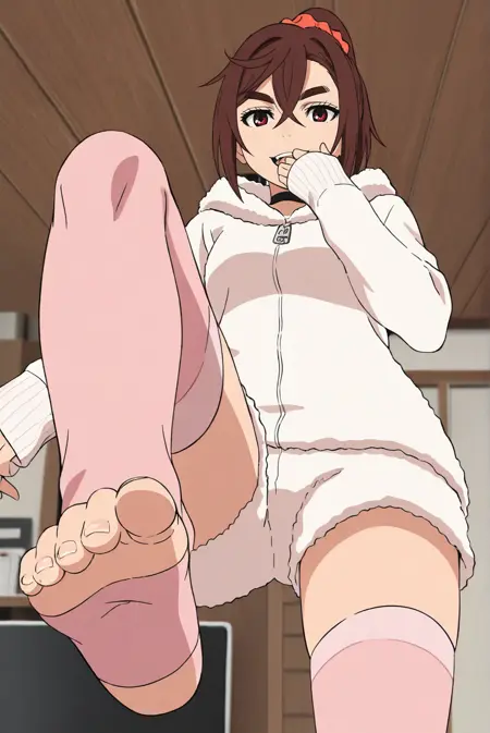 outfit_4, 黑色项圈, 睡衣, 毛领, 白色连帽衫, 拉链, 帽兜, 帽兜下垂, 袖子过手腕, 白色短裤, 短短裤, 粉色大腿袜, 无趾袜, 凉鞋,