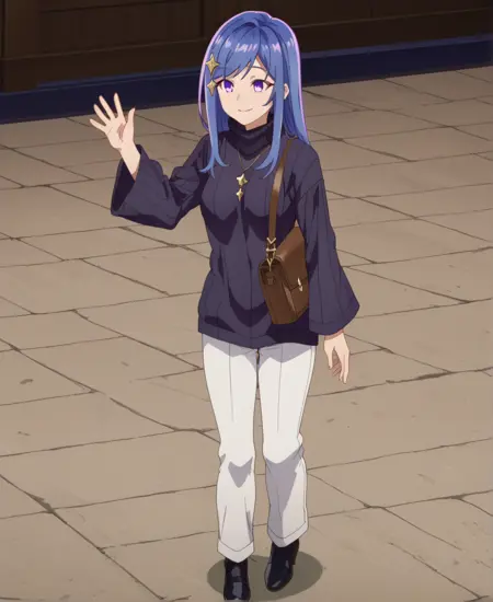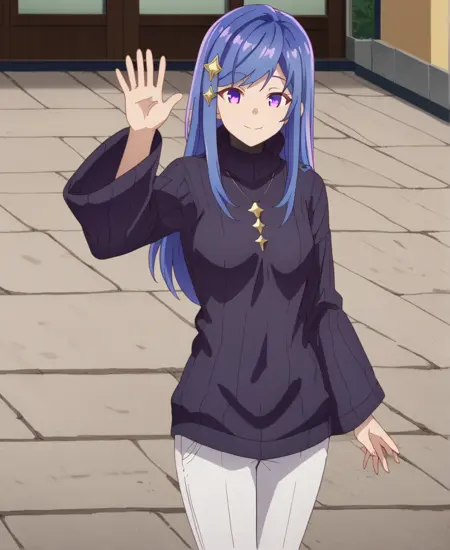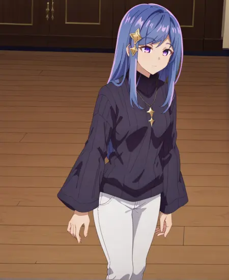 Maha, 1girl, solo, purple eyes, long hair, blue hair, hair ornament, sidelocks,