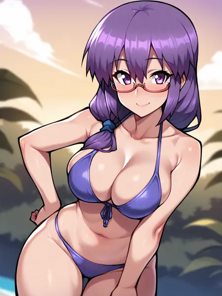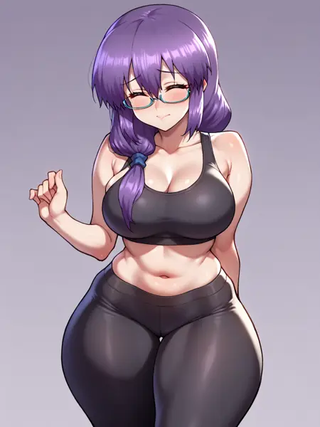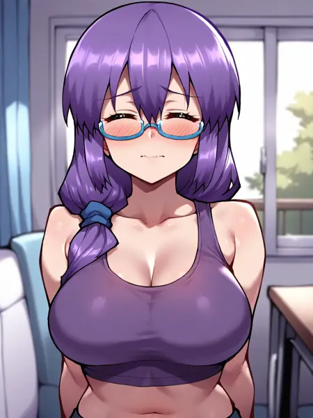 juno_mgr, 자주색 머리카락, 안경, 눈을 감음, 긴 머리, 반프레임 안경,