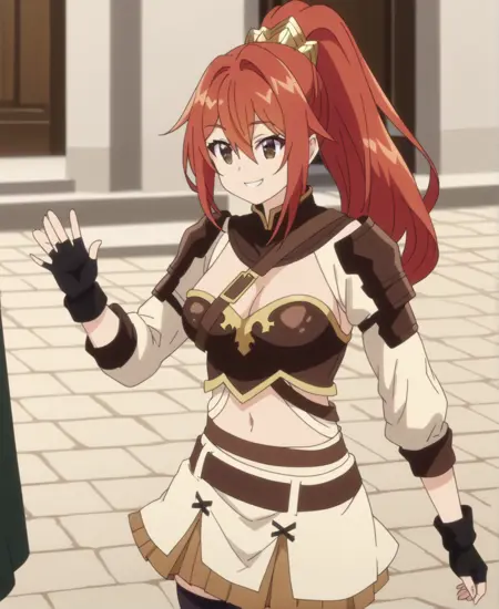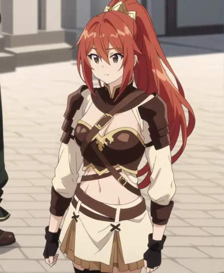 Milly, 1girl, solo, red hair, brown eyes, ponytail, navel, hair between eyes, long hair, sidelocks, hair ornament,
