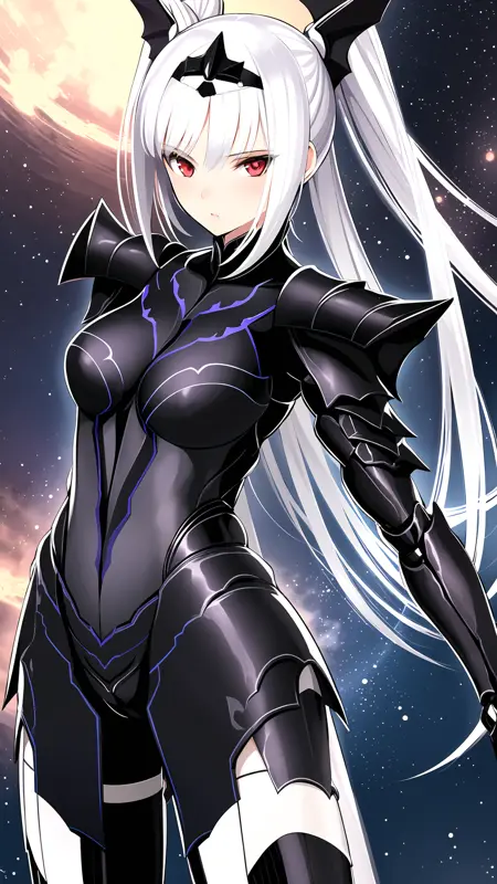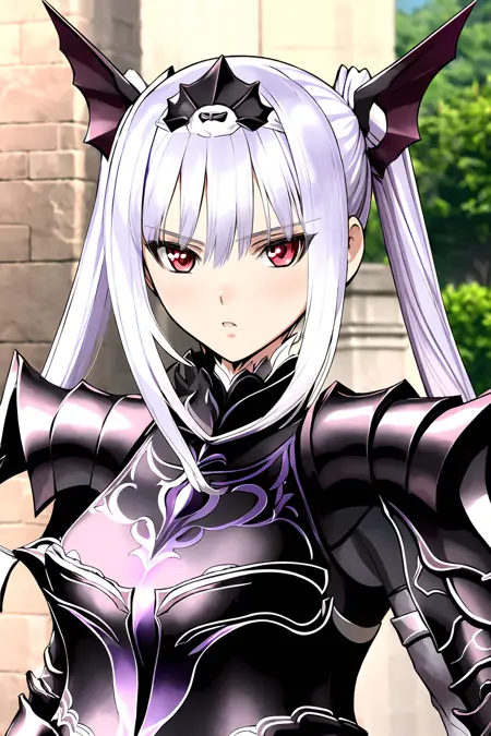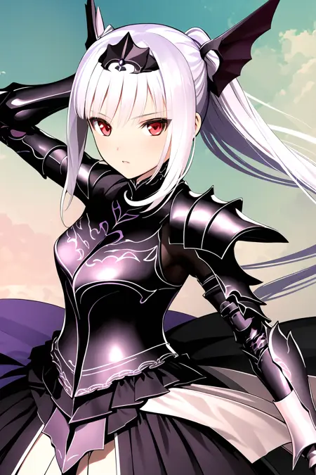 빨간 눈, 긴 은색 머리카락, 머리 장식, 갑옷, 프릴