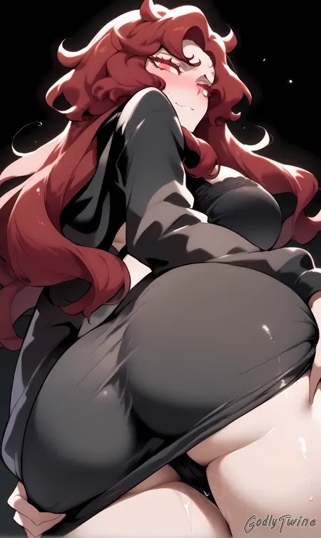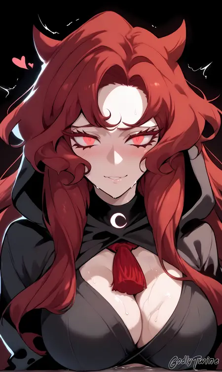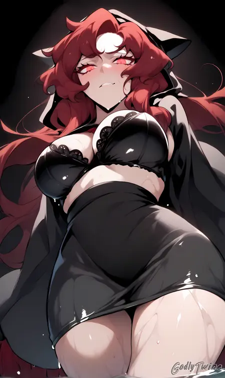 Mino Han, red eyes, red hair, long hair, wavy hair, latex miniskirt, long sleeves, latex bra, hood up, black gloves, white crescent necklace