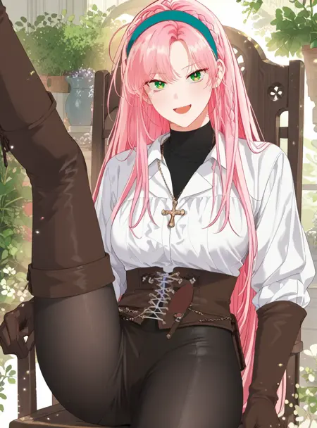 ailette rodeline, 1girl, pink hair, green eyes, long hair,