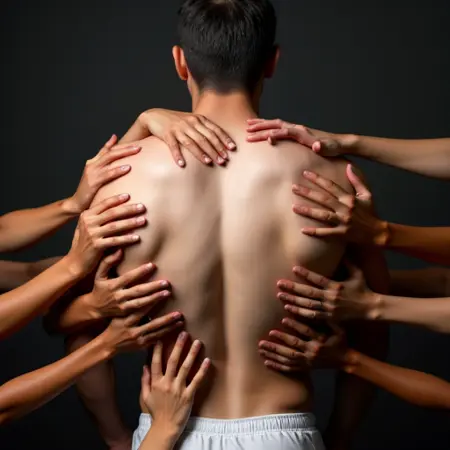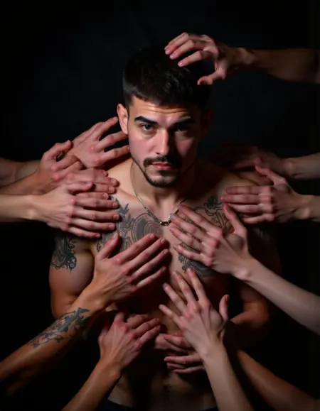 Create images of men getting grabbed by multiple people. Keyword: covered in multiple hands.