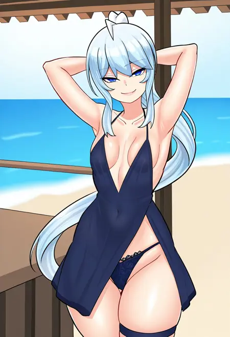 ルイナ: ruina、細いウエスト、細いヒップ、青い鋭い目、美しい薄い青髪、ポニーテール、アホ毛、前髪、小さな胸、