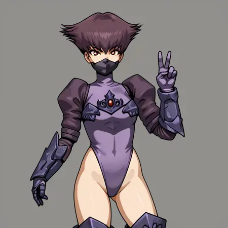 一般的なタグ - 1girl, solo, 紫髪, 短髪, アーマー, マウスマスク, リージョード, 赤い目, グローブ, ブーツ