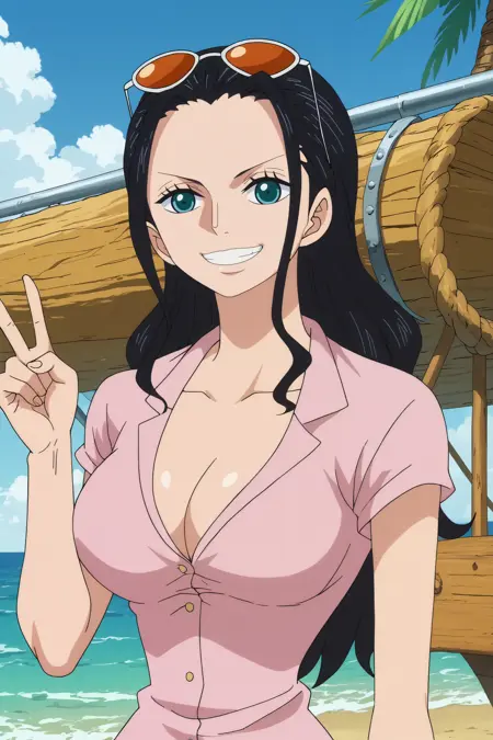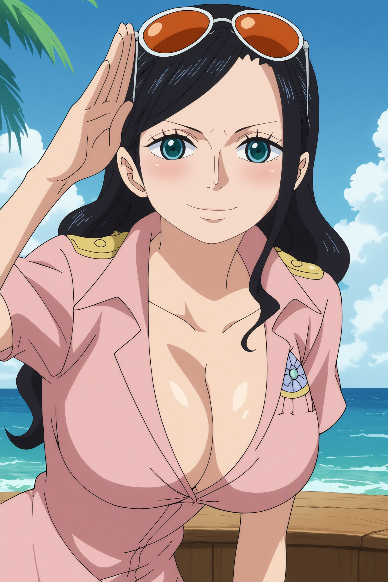 触发词:nico robin,1girl,solo,mature,eyewear on head,sunglasses,long hair,breasts,smile,cleavage,large breasts,looking at viewer,collarbone