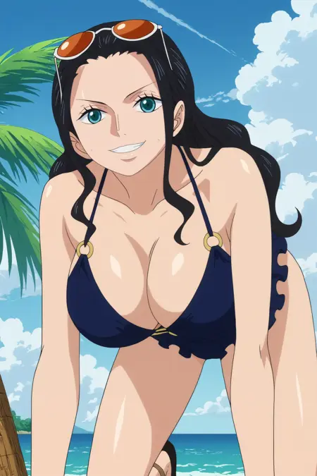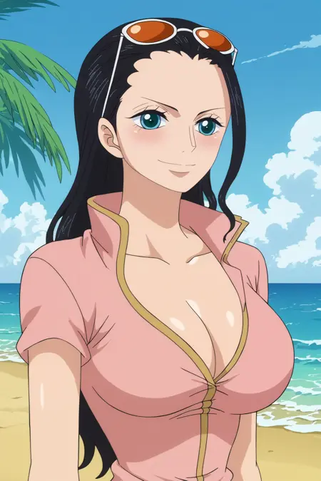 트리거: nico robin,1girl,solo,mature,eyewear on head,sunglasses,long hair,breasts,smile,cleavage,large breasts,looking at viewer,collarbone