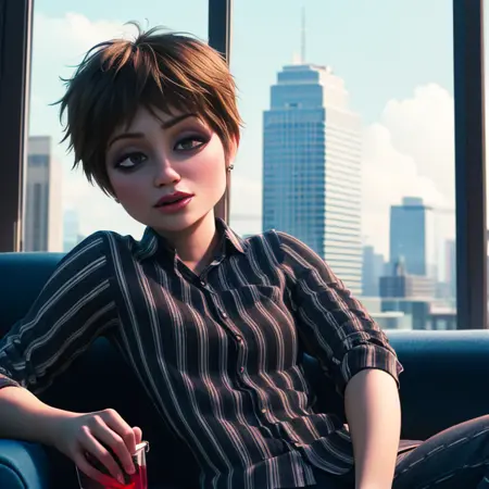 vertical-striped bodysuit, - which she wore a gas mask, - may need chest harness, and belt, in NEG
