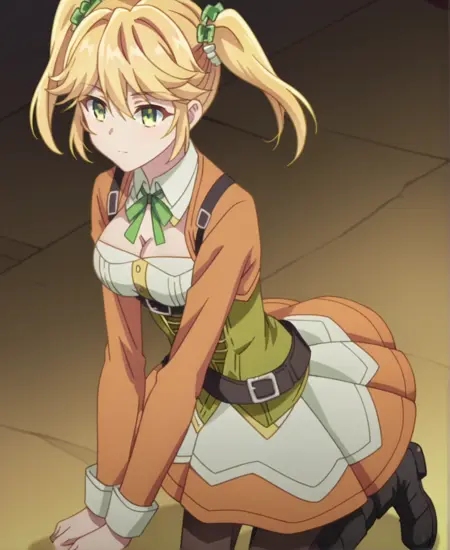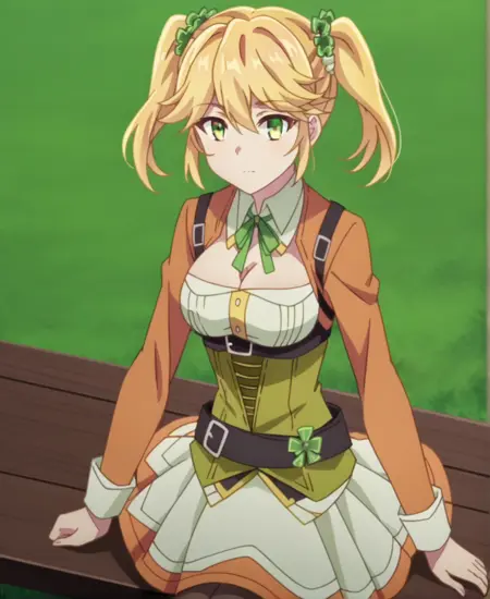 | 训练词汇 | Tart, 1girl, solo, blonde hair, twintails, hair ornament, green eyes, hair between eyes, scrunchie, hair scrunchie, long hair, 已复制! pantyhose, skirt, black pantyhose, long sleeves, jacket, belt, cleavage, green ribbon, black boots, ribbon, dress, brown belt, neck ribbon, corset, ribbon, jacket, long sleeves已复制! |